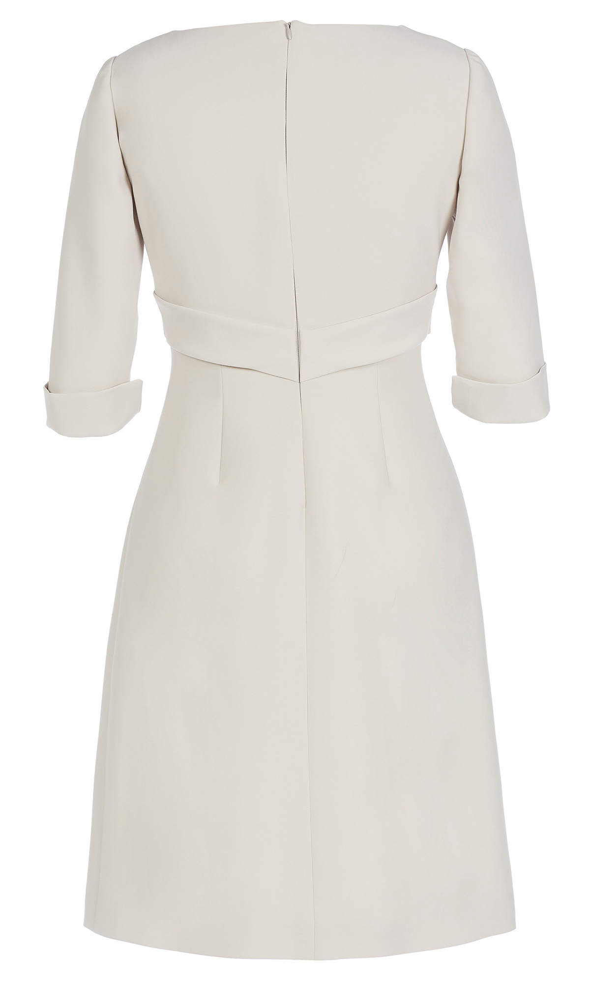 Vestido de fiesta corto de color beige con escote redondo y manga francesa, acompañado por un lazo en la cinturilla del mismo tono.